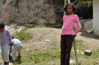 A young girl rests on a pipe in the community